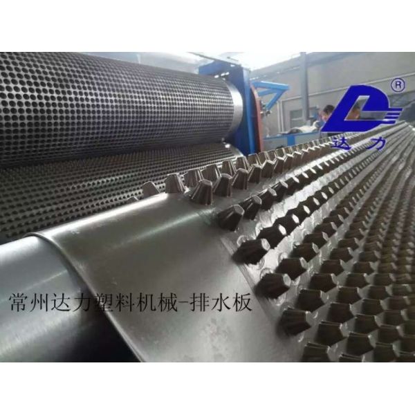 The production line using a variety of resins such HDPE, LLDPE, MDPE resin etc.(New materials & recycled materials are available) as raw materials, and adopts casting extrusion and vacuum plastic absorption process through concave and convex roller to produce single color / double color drainage sheet,Its shape is a circular cone, cylindrical, spherical shell with three-dimensional space and a certain support solidity. Liquids and gases can flow in it to achieve the effect of preventing and draining water.